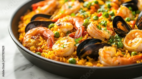 Vibrant Seafood Paella with Shrimp, Mussels, and Fresh Vegetables