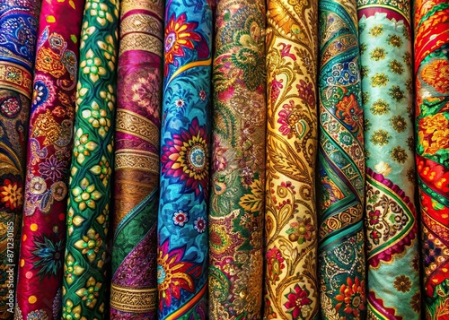 Vibrant seamless image featuring assorted patterned silk fabrics with intricate designs, rich textures, and bold colors, perfect for backgrounds, textures, and design elements.