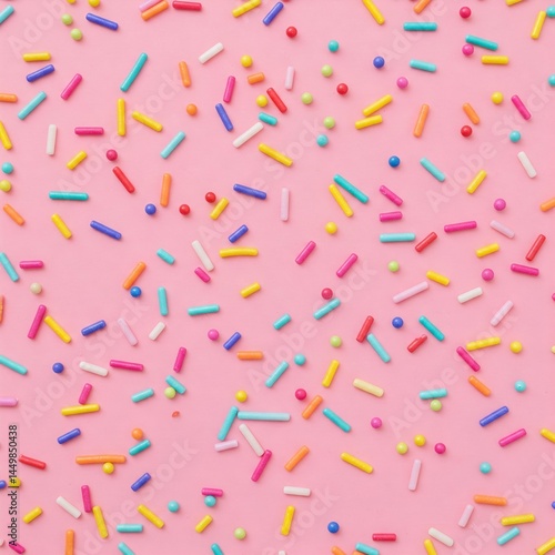 Vibrant Seamless Pattern of Colorful Candy Sprinkles. Photorealistic Jimmies & Nonpareils Scattered on Pink Background. Fun Confectionery Texture Flat Lay for Party or Baking Themes.