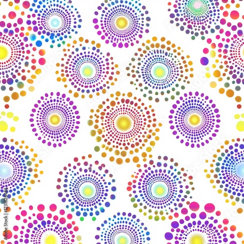 Vibrant Seamless Pattern of Metallic Circles and Dots on White Background