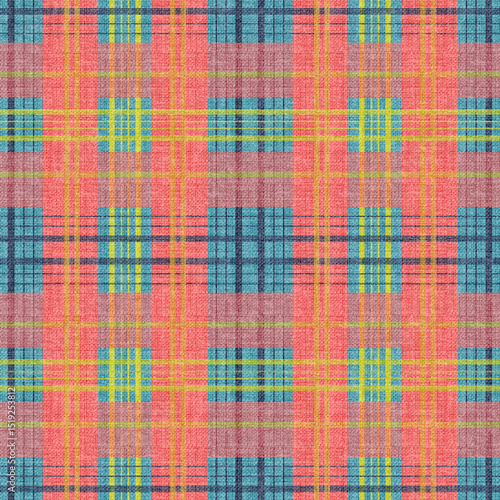 Vibrant seamless plaid texture background. Retro color palette tartan fabric with a woven canvas or linen effect. Features bold lines in pink, yellow, blue, and teal. Great for textile, scrapbook, and