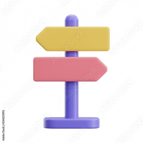 Vibrant signpost with yellow and pink arrows on purple post against white background, travel, direction, guidance, navigation, choice, modern, colorful, clean, minimal design.