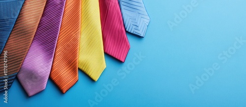 Vibrant silk ties in various colors arranged neatly on a blue background with ample space for text and branding opportunities