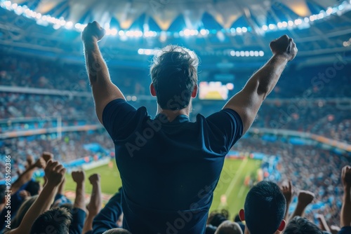 Vibrant soccer stadium scene intense match between navy blue-clad players, one raising arms in celebration frustration. Low-angle shot emphasizes towering stadium lights, excited fans blurred faces.