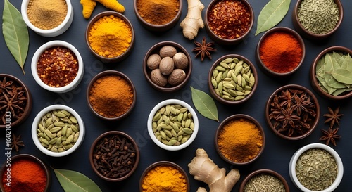 Vibrant Spices and Herbs Assortment Flatlay on Dark Surface
