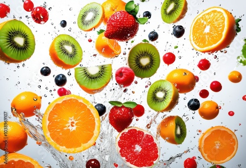 vibrant splash colorful fruits motion bright background creating fresh lively visual experience, apple, berry, banana, citrus, grapefruit, lemon, lime, mango