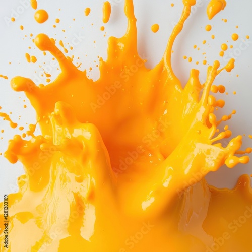 Vibrant splash of orange paint creates dynamic abstract art on a clean white background studio shot with high speed photography