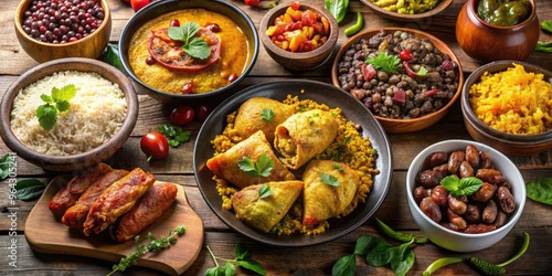 Vibrant Spread Of Traditional Puerto Rican Dishes, Including Mofongo, Empanadas, Rice And Beans, And Roasted Pork.
