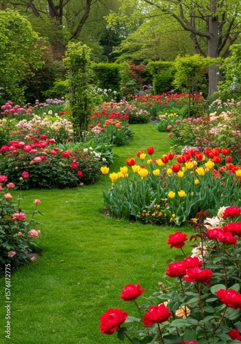 Vibrant Spring Garden with Red Roses and Yellow Tulips