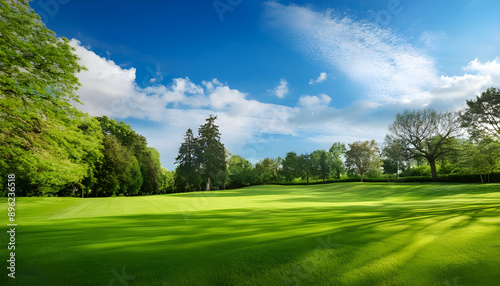 Vibrant spring nature backdrop with a pristine, neatly trimmed lawn and lush trees under