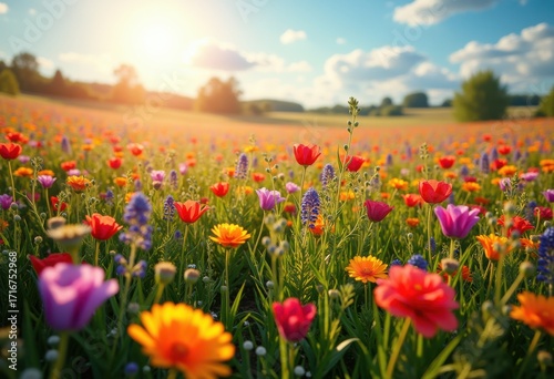Vibrant Spring Wildflower Fields Blooming with Colorful Petals and Lush Greenery in Bright Sunshine