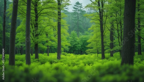 Vibrant springtime forest with lush green leaves and blooming trees, showcasing the beauty of nature's renewal.