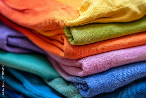 Vibrant stack of colorful textiles, focus on texture. AI image
