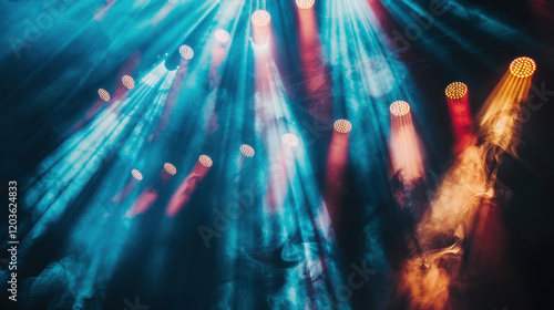 Vibrant stage lights illuminate smoky atmosphere, creating dynamic visual experience. interplay of colors adds energy and excitement to scene