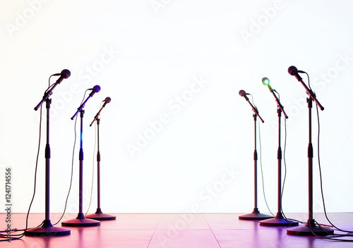 vibrant stage set features colorful microphones crisp white backdrop dynamic live performance