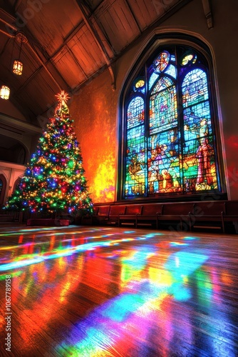 Vibrant stained glass windows illuminating a church, reflecting the colors of hope and faith in the Christmas season.
