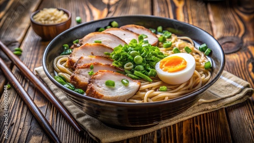 Vibrant, steaming bowl of savory ramen noodles topped with sliced pork, boiled egg, and green onions on wooden table.