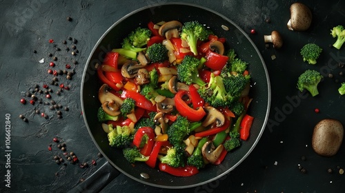 Vibrant stir fried vegetables featuring bell peppers broccoli and mushrooms displayed in a pan on a dark textured background with scattered peppercorns