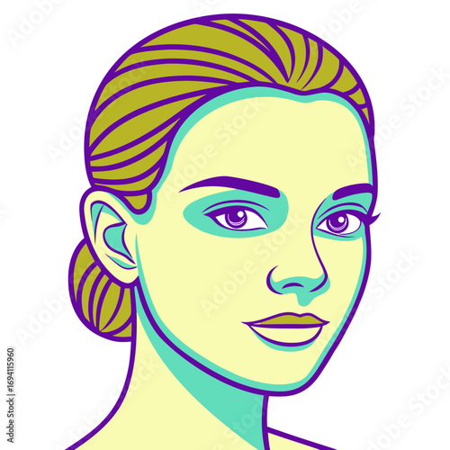 Vibrant stylized vector illustration of a young woman's face portrait for scalable graphic design white background