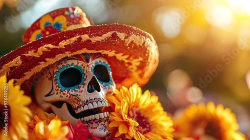 Vibrant sugar skull adorned with flowers, surrounded by sunshine, symbolizing Day of the Dead celebration.