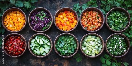 Vibrant summer salads in bright bowls outdoors during golden hour top-down shot of colorful vegetables
