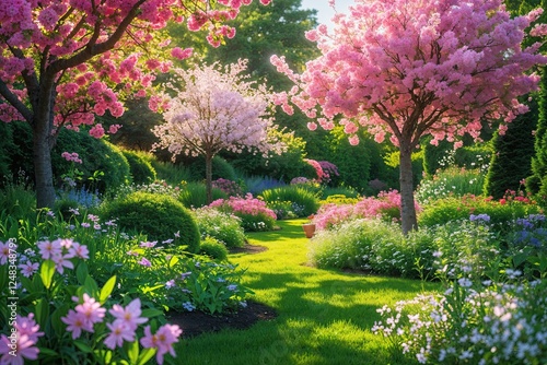 Vibrant Summer Scene with Lush Greenery and Blossoming Trees in Bright Garden Light