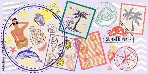 Vibrant summer vacation collage featuring tropical elements and beachy icons