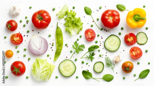 Vibrant summer vegetable medley: fresh tomatoes, onion, cucumber, peas, garlic, cabbage, peppers, and radish arranged artfully on white background - food concept