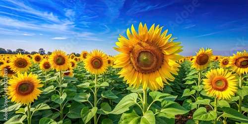 Vibrant sunflowers in a field under a clear blue sky, sunflowers, field, farm, agriculture, yellow, vibrant, sun, nature, growth