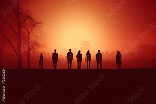 Vibrant sunrise crowd, silhouetted human gathering, red dawn gathering, shadowed silhouette crowd, smog, voices, meeting, assembly, convention, generative AI, JPG