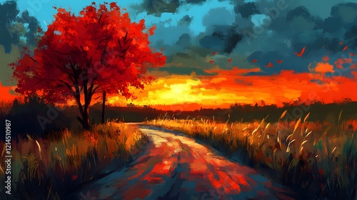 Vibrant Sunset Landscape Painting Autumn Tree Country Road