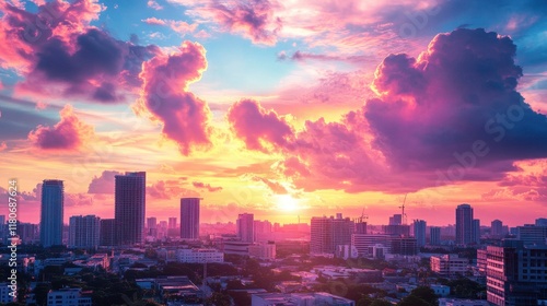 Vibrant sunset over a city skyline, pink and purple clouds. Ideal for travel, real estate, or city lifestyle projects.