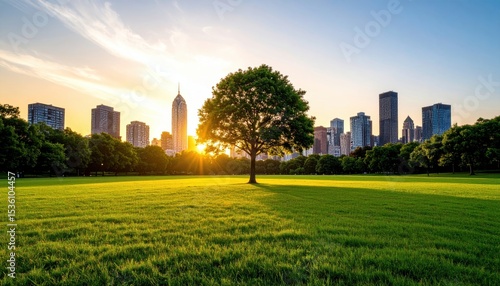 Vibrant sunset over a city skyline with a solitary tree in a lush green park setting