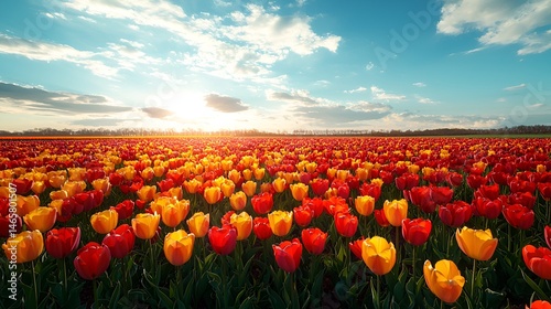 Vibrant sunset over a vast field of red and yellow tulips.
