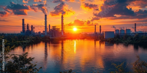 Vibrant sunset over an industrial complex situated along a tranquil river. Reflective waters mirror the fiery sky and factory structures