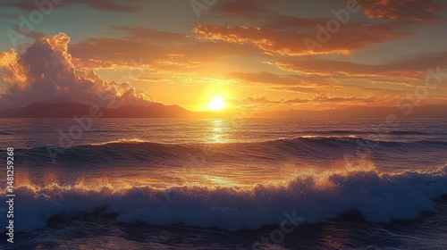Vibrant sunset over calm ocean waves with distant mountains and glowing clouds under a colorful sky