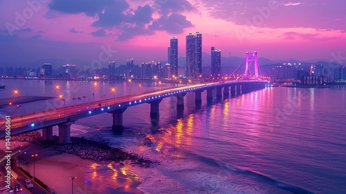 Vibrant sunset over city skyline with illuminated bridge and coastal highway.