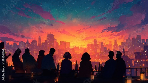 Vibrant Sunset Over City Skyline with Silhouetted People Celebrating