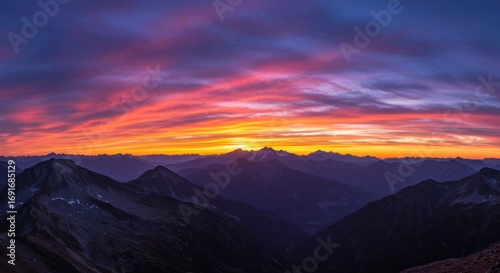 Vibrant Sunset Over Jagged Mountain Peaks Painting the Sky with Fiery Hues