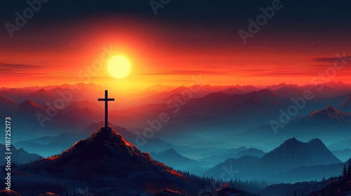 Vibrant sunset over mountains with cross silhouette landscape. Easter, Pascha, Paskha, Ostern, Pascua, Paques - Orthodox and Catholic Holiday celebration