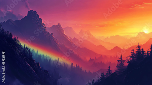 Vibrant Sunset over Silhouetted Mountains and Rainbow Landscape