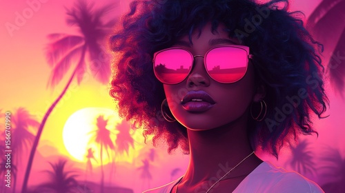 vibrant sunset portrait of a stylish woman with pink sunglasses and palm trees in the background
