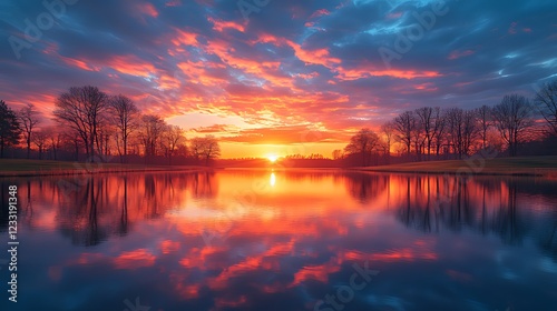 Vibrant sunset reflecting on calm lake, trees, peaceful sky