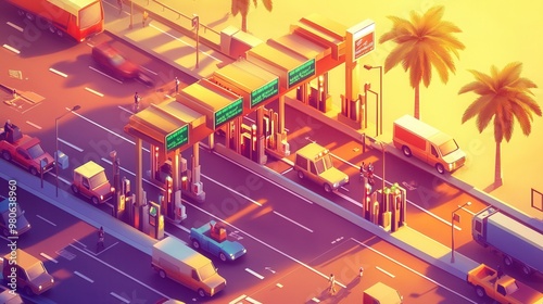 Vibrant Sunset Scene at a Busy Gas Station with Palm Trees