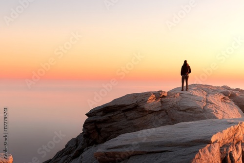 Vibrant sunset view from rocky cliff with solitary figure overlooking serene sea