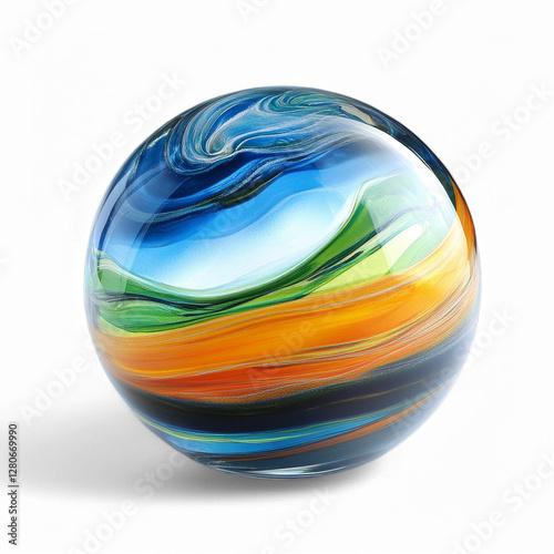 Vibrant swirled glass sphere with multicolor stripes on transparent background