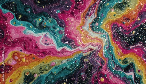 Vibrant, swirling abstract painting with glitter