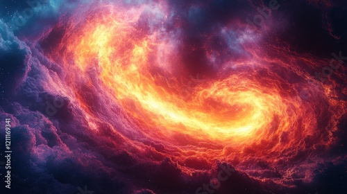 Vibrant swirling galaxy with fiery orange and purple hues set against a starry cosmic backdrop