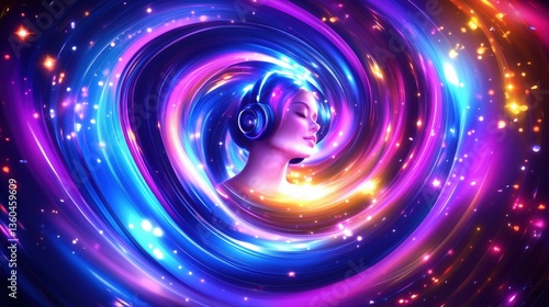 Vibrant swirling lights envelop a woman with headphones in a cosmic music-inspired atmosphere