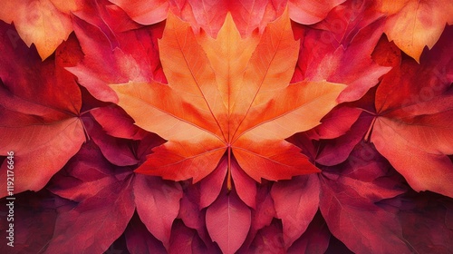 Vibrant Symmetrical Arrangement of Bright Red and Orange Maple Leaves on a Rich Texture Background Showcasing the Beauty of Autumn Season